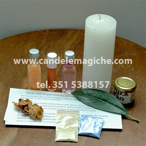 Il kit comprende: procedura rituale, candela bianca sette giorni, olio di violetta, olio petali di rosa bianche, polvere dimenticanza, polvere canfora, foglie di basilico, acqua fiori di arancio, sette petali di rose bianche, mistura di burro zucchero e cacao.